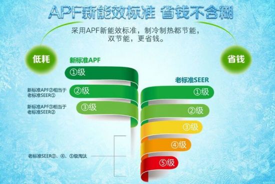 据悉,2013年10月1日实施的转速可控性房间空调器标准采用了全年能源消耗效率(apf)考核指标,增加了对制热工况的考核,同时大幅提升了产品的能效水平要求。相比于旧的seer变频空调能效标准,变频空调能效等级新标准《转速可控型房间空气调节器能效限定值及能源效率等级(apf标准)》在能效等级、限定值等方面都做出了改变。修改后的变频空调能效等级将原来的5级改为3级,能效要求整体提升。