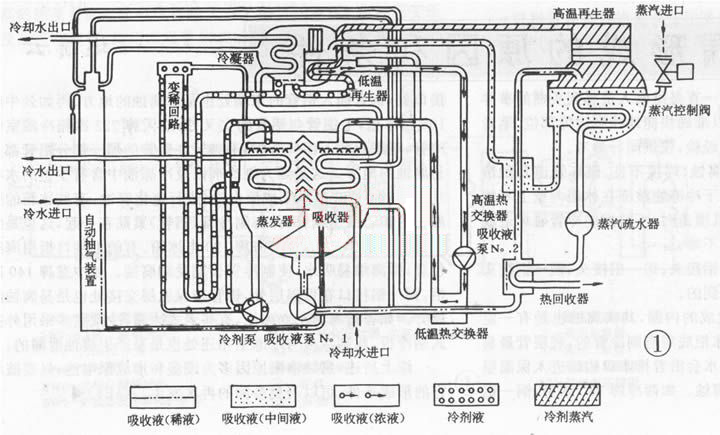 (1)外界热源加热来自吸收器,经高、低温热交换器后,温度高的稀溶液使之蒸发浓缩,产生冷剂蒸汽,同时形成中间浓度的溶液。