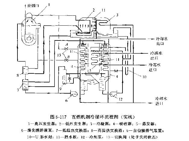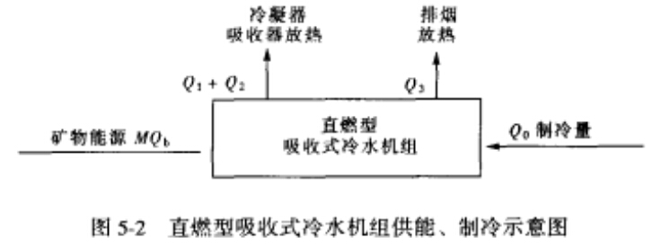 直燃式溴化锂吸收式制冷机组是靠轻油或燃气燃烧产生的热量提供动力,驱动制冷装置运行。其供能、制冷原理如图5.2所示。
