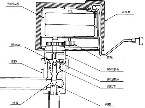 电动膨胀阀是一种以步进电机驱动的电子膨胀阀,它通过给步进电机施加一定逻辑关系的数字信号,使步进电机通过螺纹驱动阀针的向前或向后运动,从而改变阀口的流量面积来达到控制流量的目的。